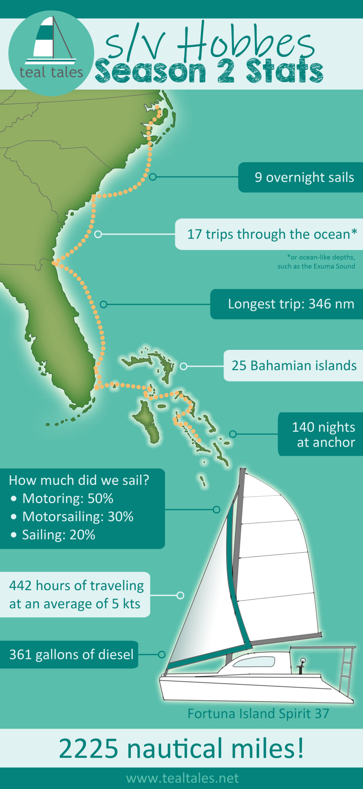 That’s awesome! I posted my infographic to reddit, and naturally they all determined that they all would have done MUCH better than us. I have a feeling that our stats are very average compared to our peers, but without data from other sailors there’s no way to prove it! But yeah, those magical days are awesome – last year we had a 3-day sail up the east coast and we barely used the engines at all, it’s crazy to think we moved that far using so little fuel!